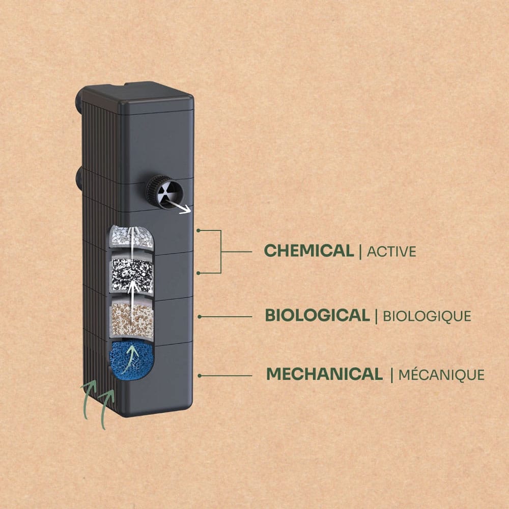 Conçu dans un souci d’efficacité et de durabilité environnementale, nous vous présentons la dernière innovation en matière de technologie de filtration pour aquarium : le filtre intérieur BIO FILTER. Doté d’un moteur plus silencieux et plus puissant, ce filtre est disponible en trois modèles – 200, 300 et 600 – et quatre variétés de masses filtrantes. La configuration modulaire des cartouches permet une personnalisation et un entretien sans faille, garantissant ainsi des performances de filtration optimales.